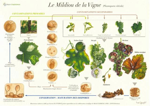 En fonction des précipitations favorables, plusieurs cycle du champignon vont contaminer les feuilles, les rameaux et les inflorescences jusqu’au stade véraison.